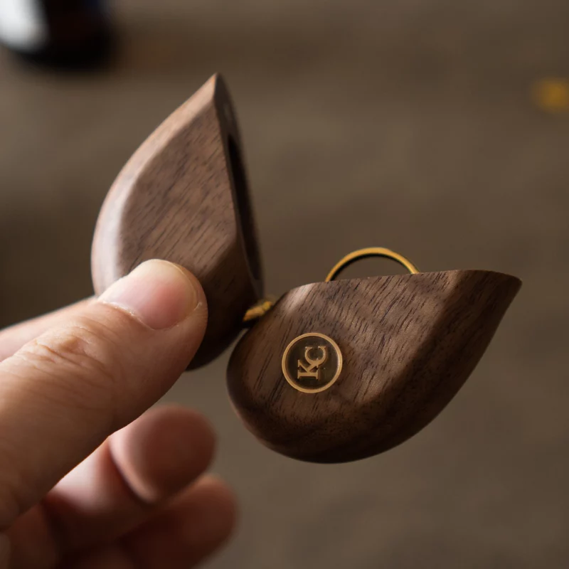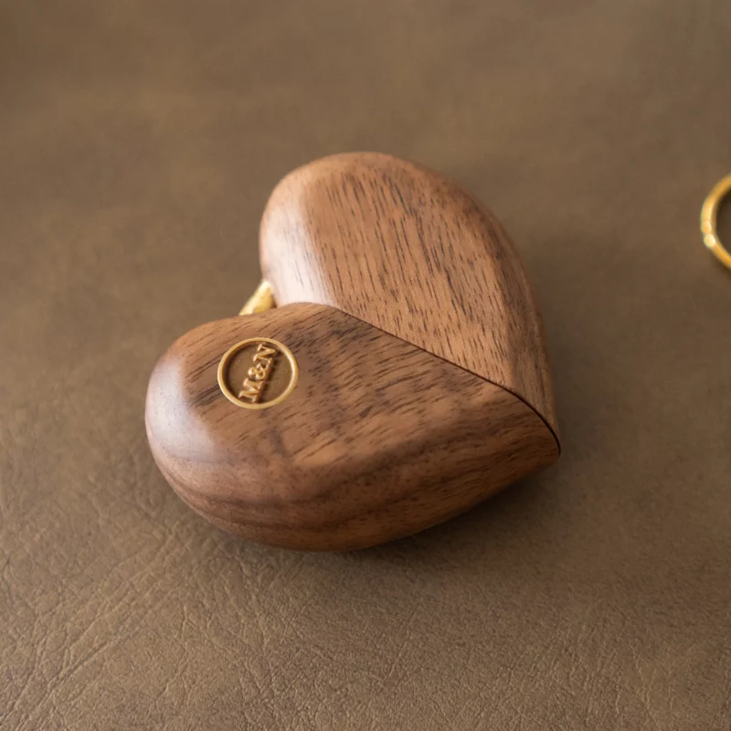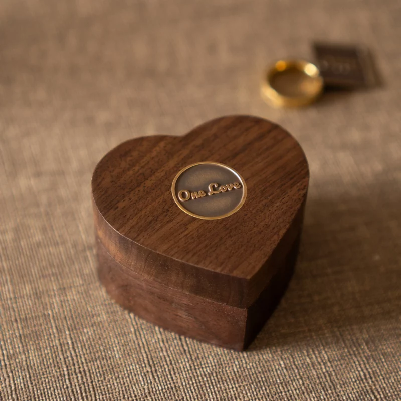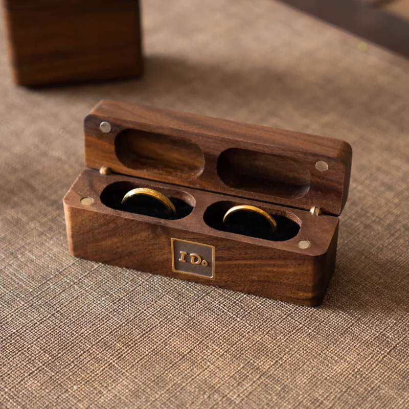 Slim Double Ring Wooden Box with Custom Antique Brass Inlay – Solid Black Walnut Pocket Wedding Case